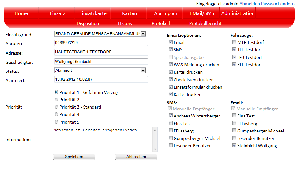 Für die Einsatzverwaltung steht zentral eine Webanwendung zur Verfügung, wo einerseits Objektdaten angezeigt werden können, sowie alle Einsätze verwaltet werden können. Im ELIS WebPortal können auch eigene Einsätze angelegt werden, welche in ELIS gemeinsam mit den WAS-Einsätzen zur Verfügung stehen.